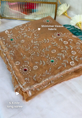 Sophisticated antique gold colour designer saree, embellished with dazzling stone work that adds a hint of glamour and drama, ideal for making a statement at elite gatherings.