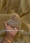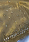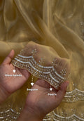 Sophisticated Mustard gold designer saree, embellished with dazzling pearl work that adds a hint of glamour and drama, ideal for making a statement at elite gatherings.