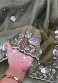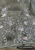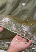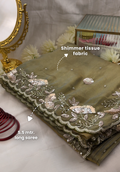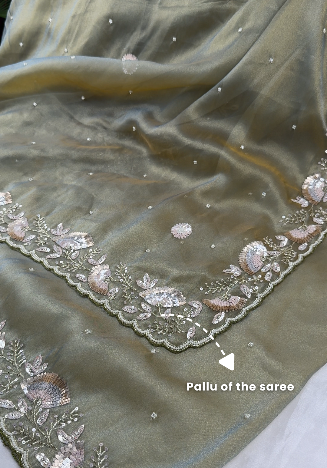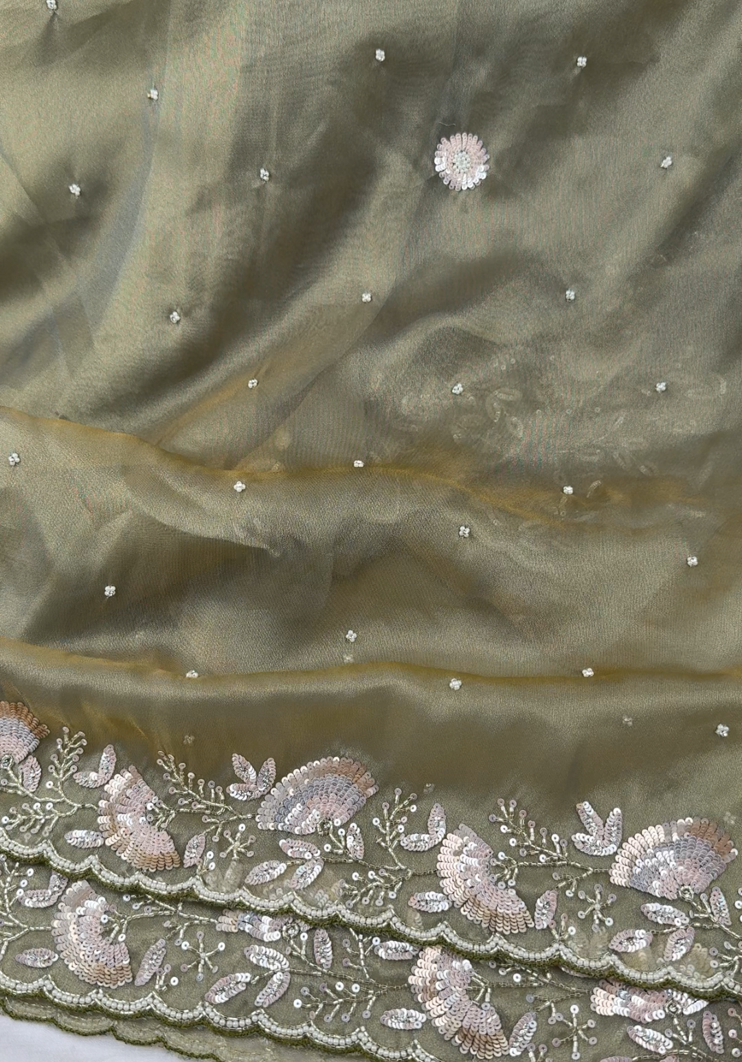 Sophisticated olive green designer saree, embellished with dazzling pearl work that adds a hint of glamour and drama, ideal for making a statement at elite gatherings.