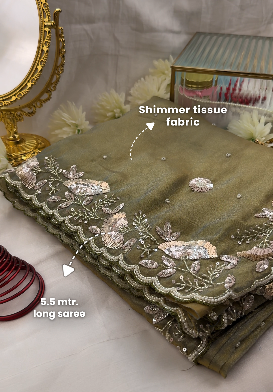 - Fabric - Shimmer tissue ( soft, light weight, body hugging fabric, saree pleats come out well )