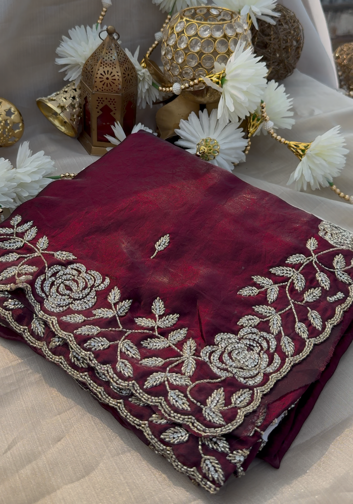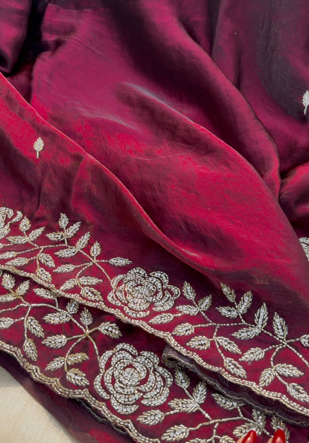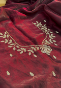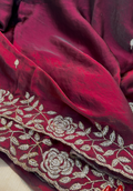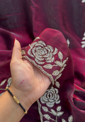Exquisite burnt maroon tora silk designer saree adorned with intricate, floral embroidery border, evoking opulence and refinement.