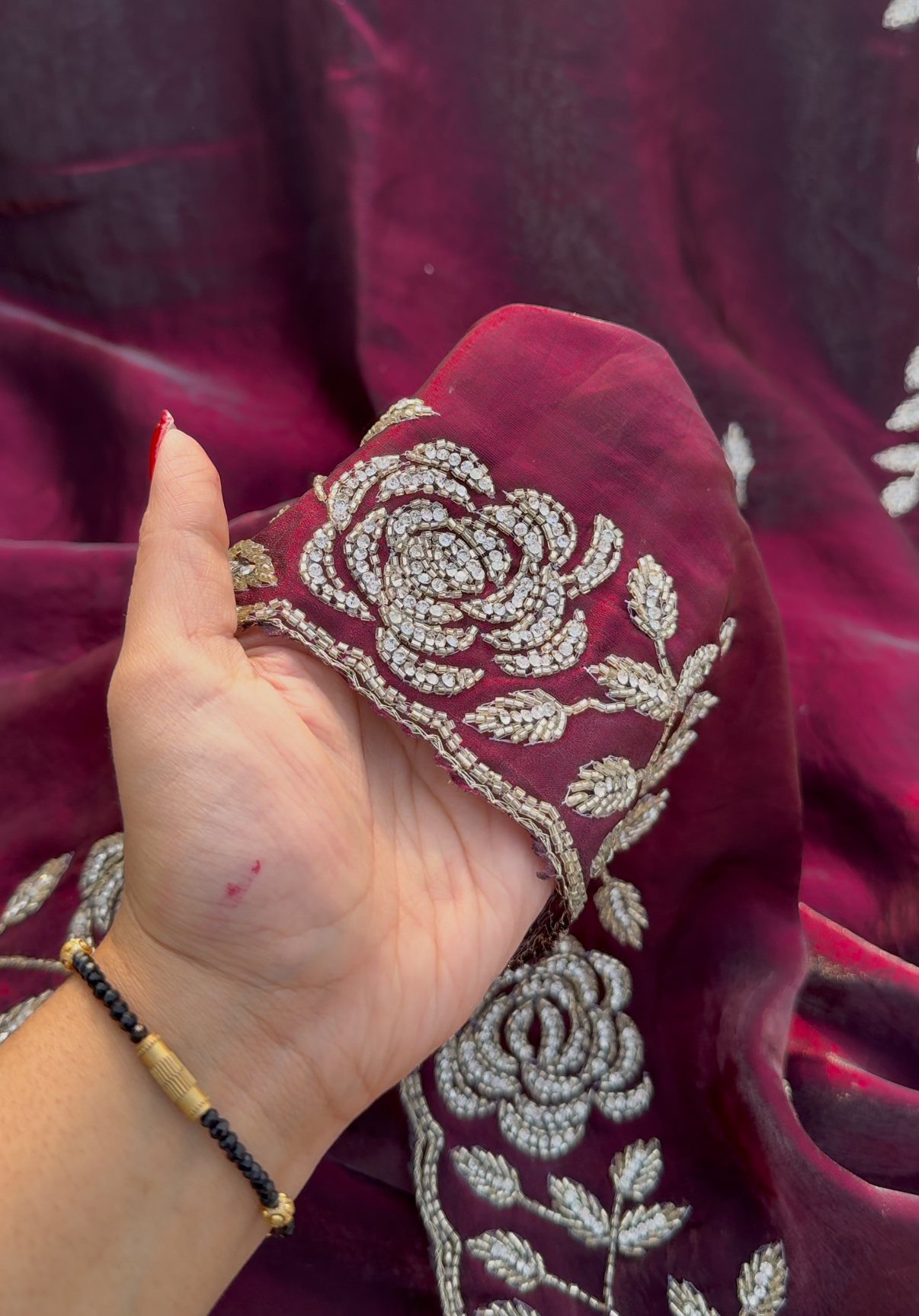 ROSALINA - Burnt maroon designer saree with glass zircon embellishment