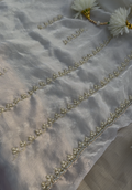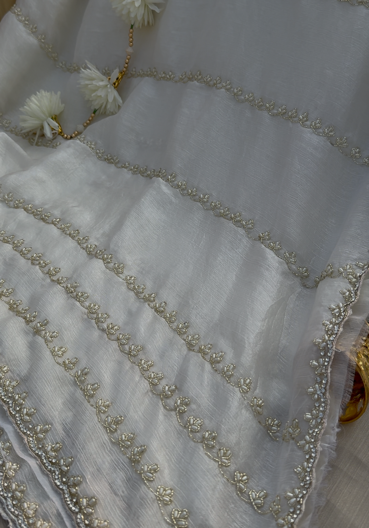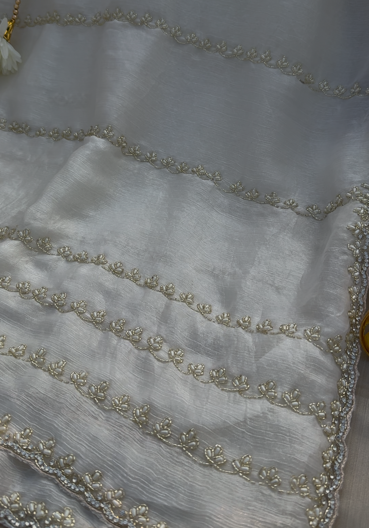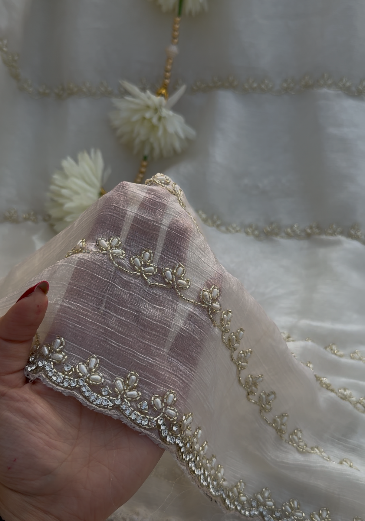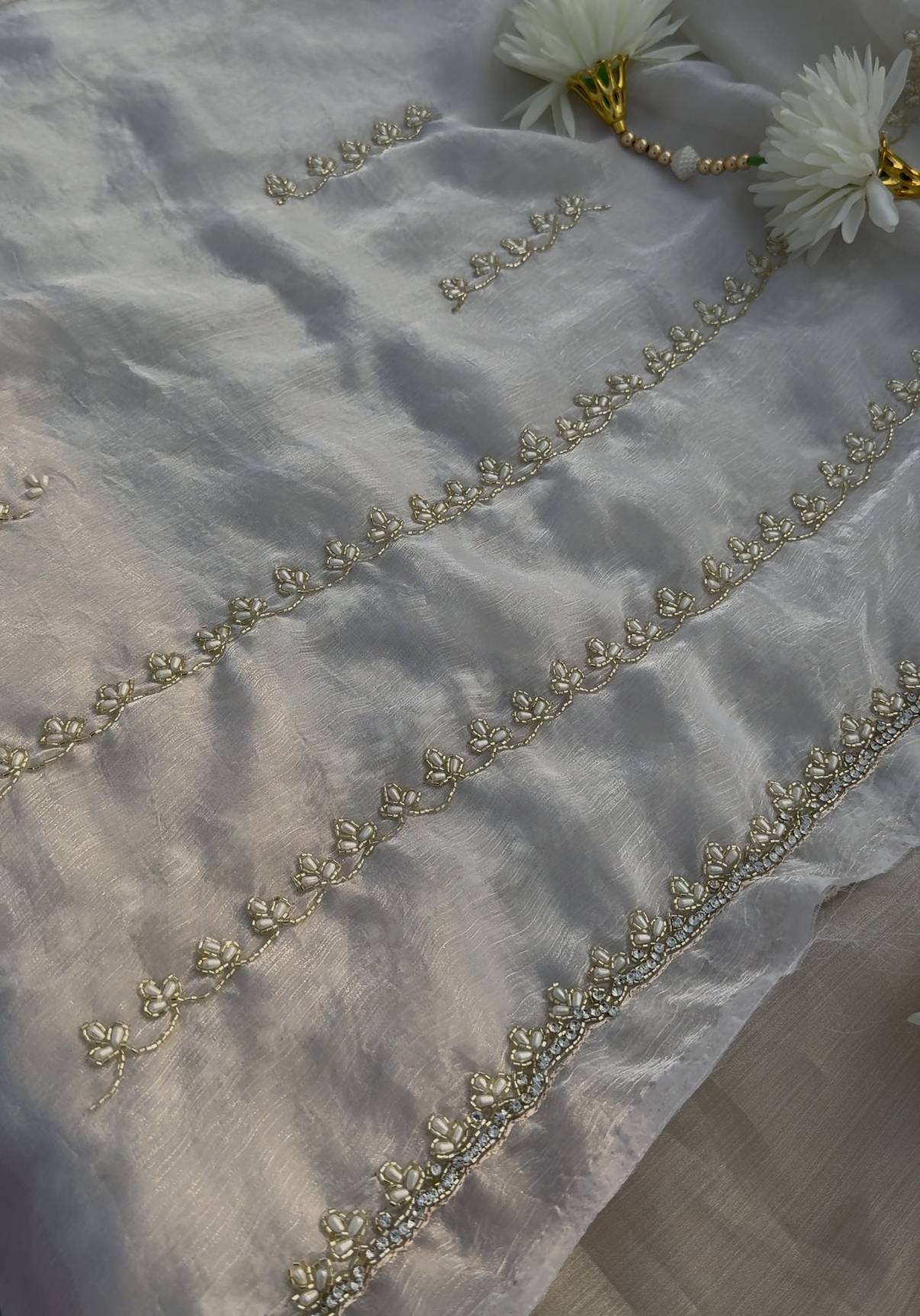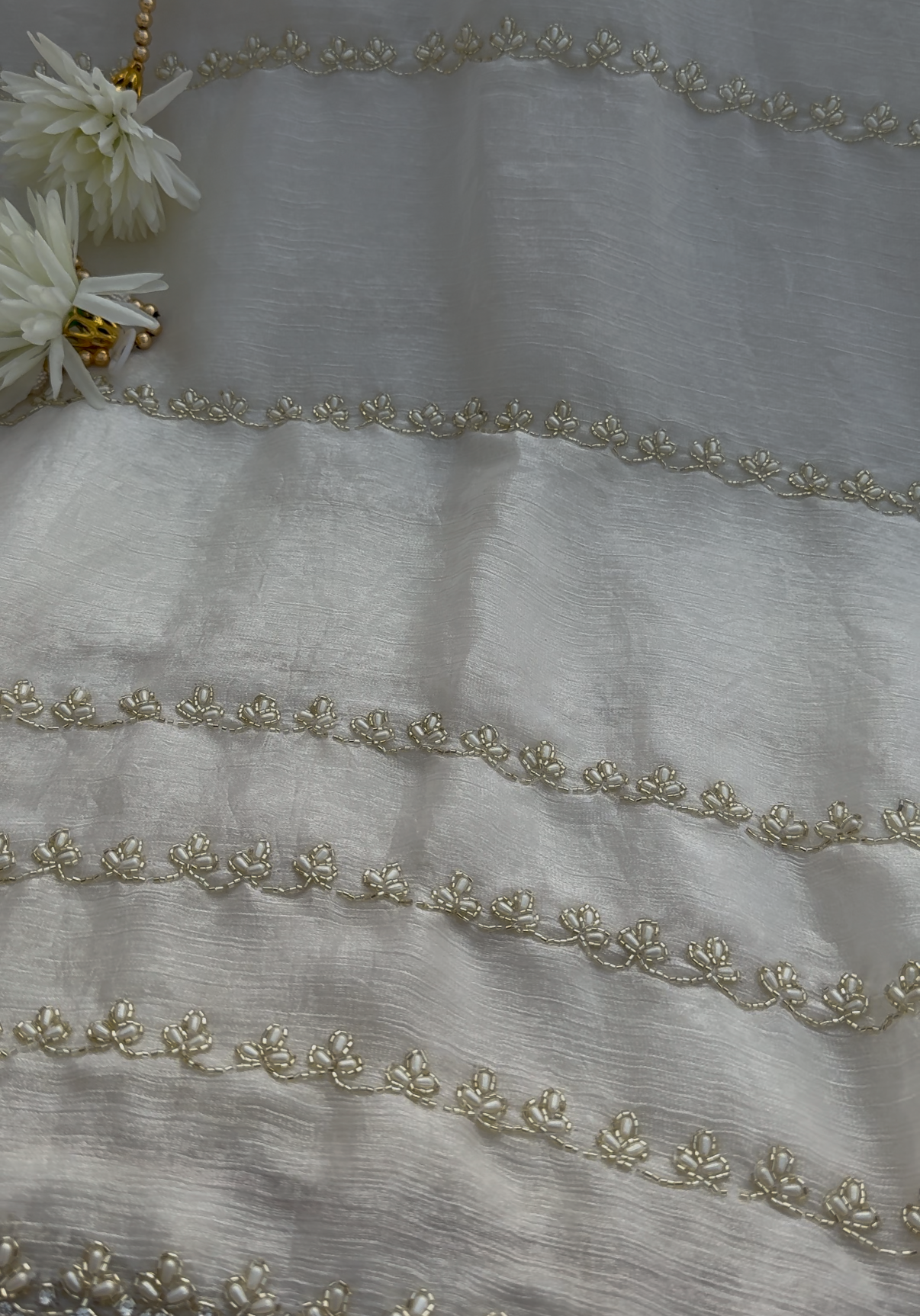 Luxurious chiffon designer saree, featuring intricate pearl embroidery that adds a touch of refinement and poise.