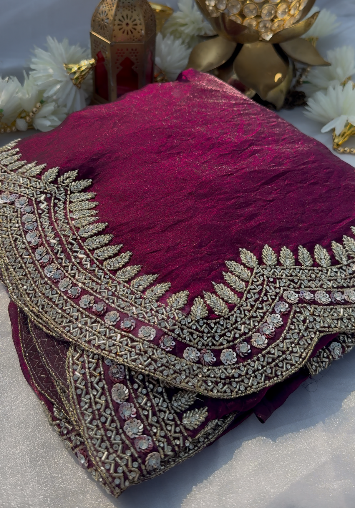Exquisite mulberry-hued Tora silk designer saree adorned with intricate, necklace-inspired embroidery border, evoking opulence and refinement.